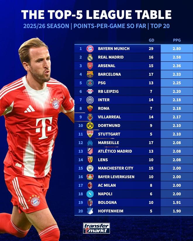 在本周末五大聯(lián)賽戰(zhàn)火重燃之前,《德國轉(zhuǎn)會市場》統(tǒng)計了本賽季五大聯(lián)賽球隊場均拿分的榜單,拜仁領(lǐng)跑,皇馬緊隨其后,阿森納排在第三。