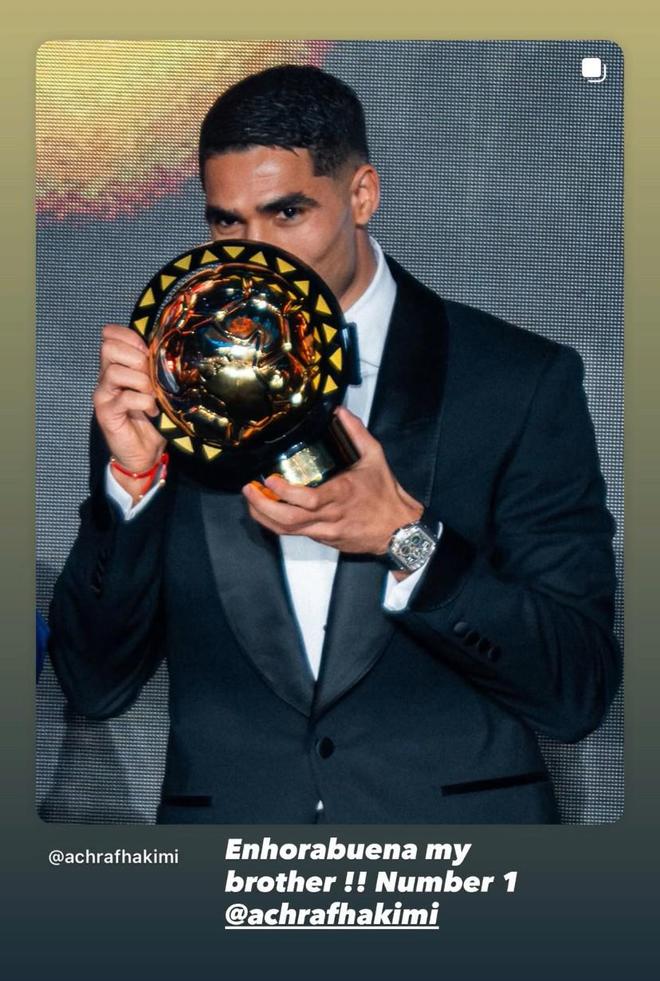 拉莫斯在社交媒體上曬出了阿什拉夫親吻非洲足球先生獎杯的照片,同時配文寫道:“祝賀我的兄弟!你是No.1!”